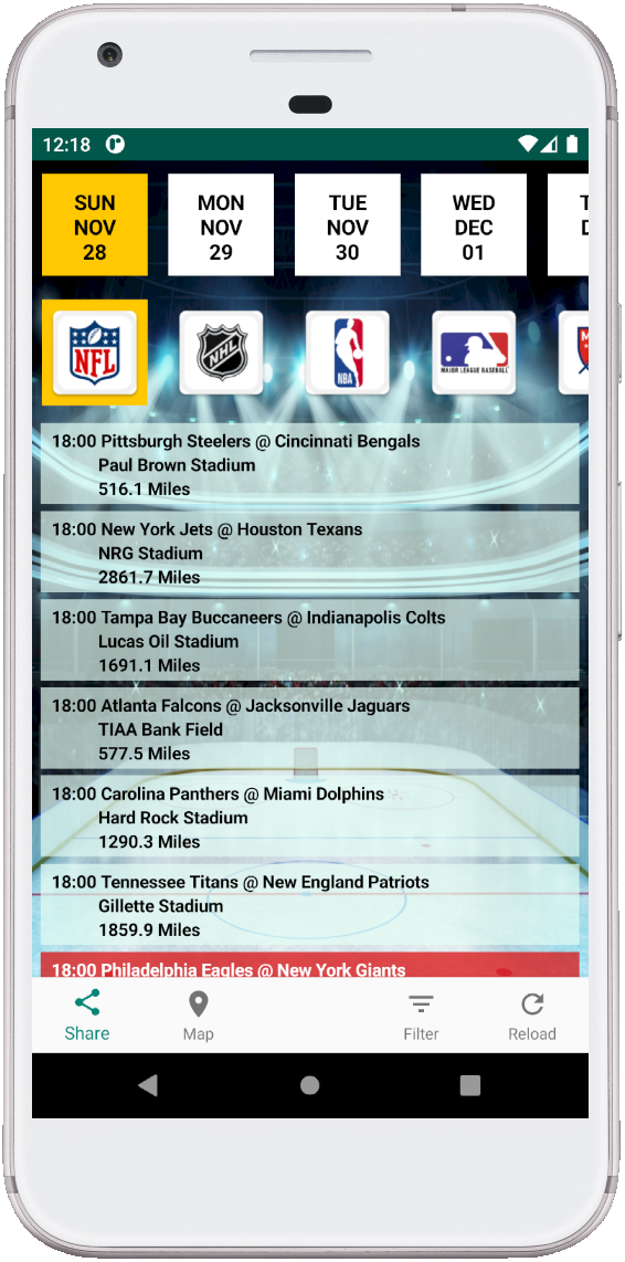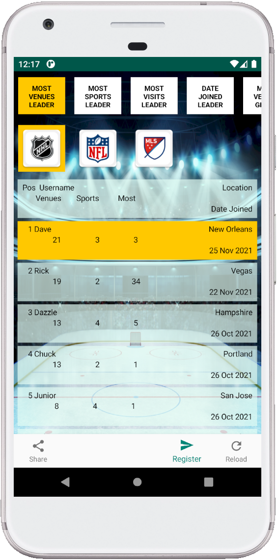 Major League Tracker can be used to track the venues, fields and arenas that have been visited within six of the Major Leagues in the Unitied States. Track the teams watched at either home or away in all Major Leagues, the NFL, NHL, MLB, MLS, NBA and MLR, all available to track in one easy to use app.
